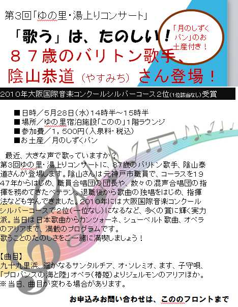 第3回ゆの里・湯上りコンサートに、87歳のバリトン歌手、陰山泰道さんが登場します。陰山さんは元神戸市職員で、コーラスを1947年からはじめ、職員合唱団の団長や、数々の混声合唱団の指揮を務めてきたベテラン。退職後から歌曲の独唱をはじめ、指揮法なども学んできました。2010年には大阪国際音楽コンクールシルバーコースで2位(一位なし)になるなど、多くの賞に輝く実力派。当日は日本歌曲からカンツォーネ、シューベルト歌曲、オペラのアリアまで、満載のプログラムです。