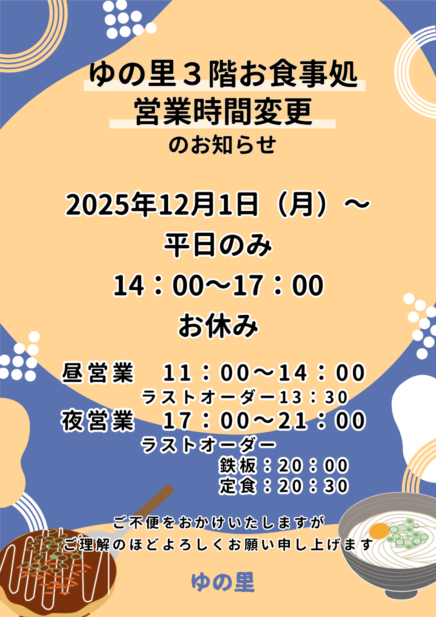 これまでゆの里3階お食事処は平日14時~17時まで軽食のみの営業とさせていただておりましたが、2025年12月1日より、平日の14時~17時まで3階食事メニューをお休みとさせていただきます。